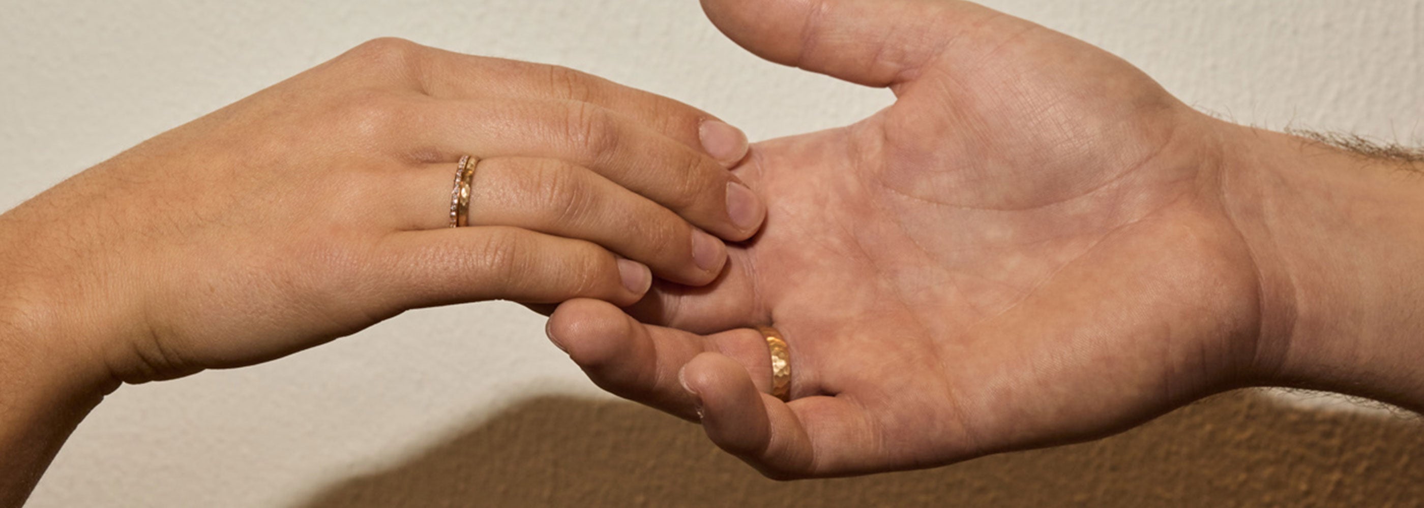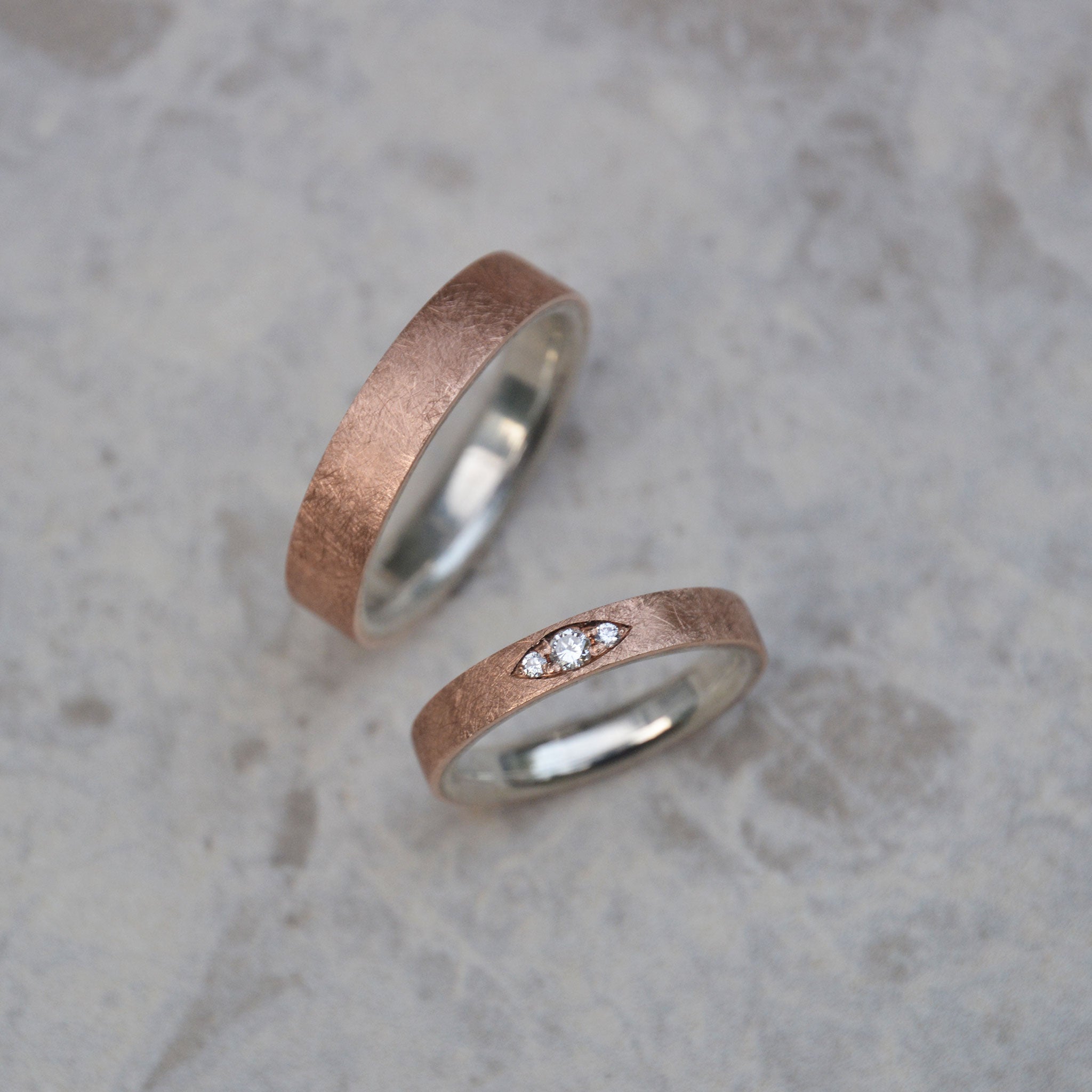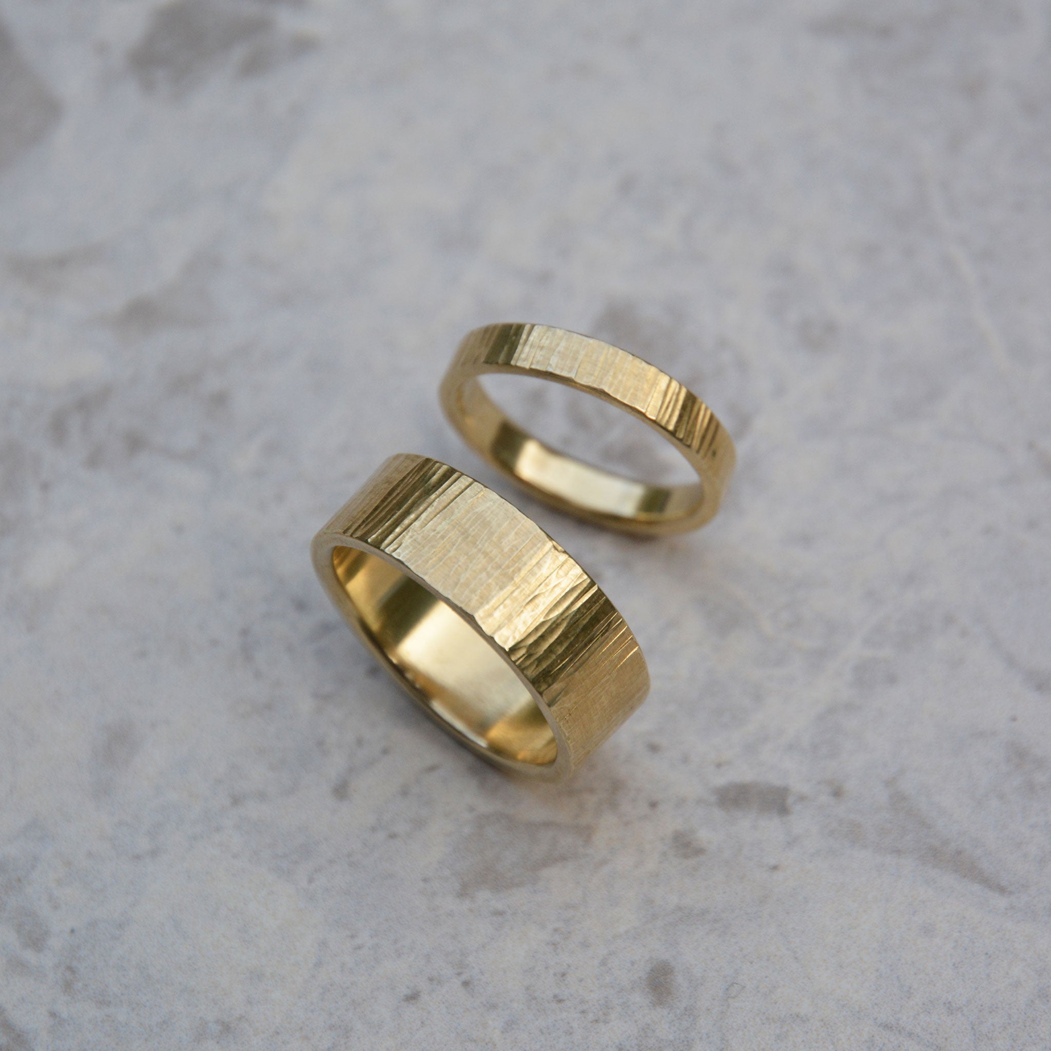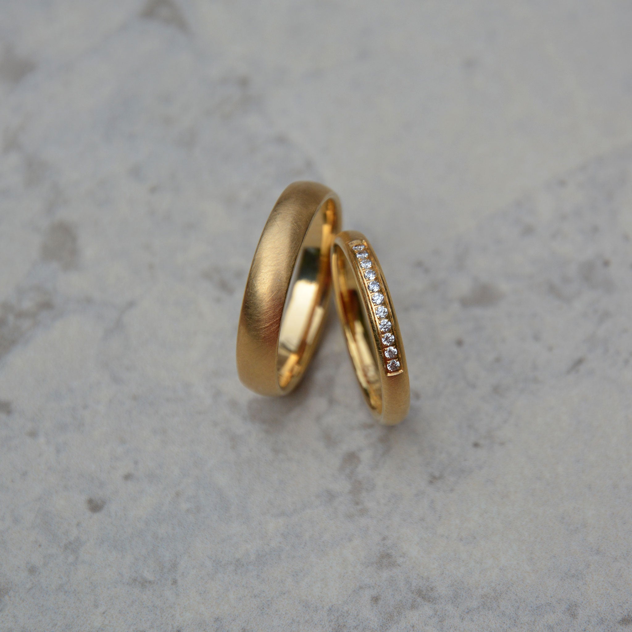 Das klassische Material für Eheringe ist Gold. Dabei verwenden wir alle gängigen Legierungen und Farben. Hier könnt ihr zwischen Gelb-, Weiß-, Rosé-, Rot-, Haselnuss- und Champagnergold wählen. Auch verschiedene Farbkombinationen sind natürlich möglich. Bei den Feingehalten arbeiten wir mit 585er und mit 750er Gelbgold, da diese Legierungen hochwertig, langlebig und handwerklich gut zu verarbeiten sind.