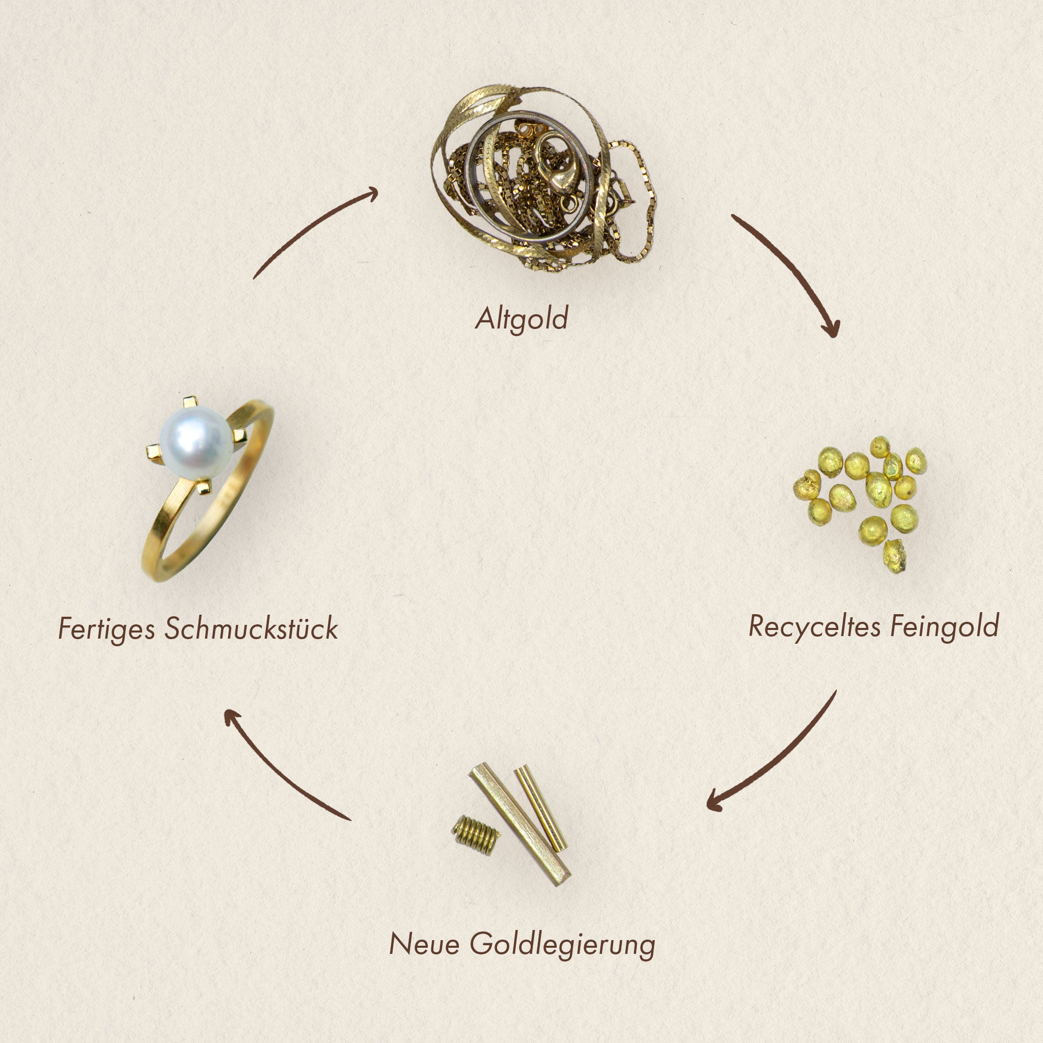 Statt auf aufwändige und ressourcenintensiven Abbau zurückzugreifen, wird hierbei bereits vorhandenes Edelmetall, wie zum Beispiel alter Schmuck, Zahngold oder elektronische Bauteile, aufbereitet und in den Kreislauf zurückgeführt.